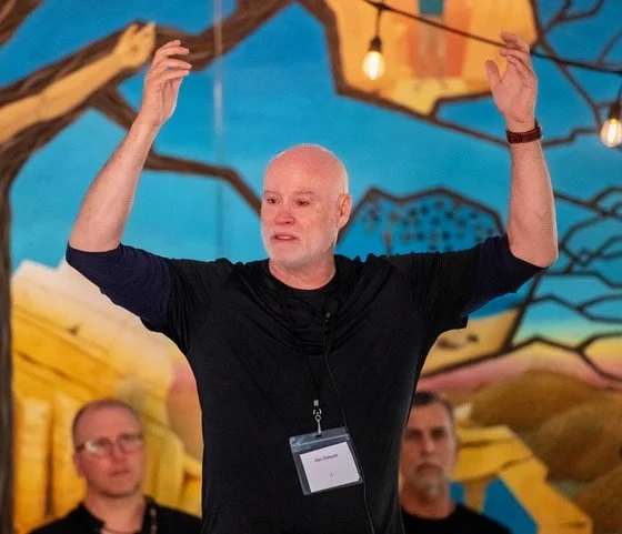 Man with short white hair and a black shirt speaking or presenting with his arms raised, behind a colorful mural or backdrop.