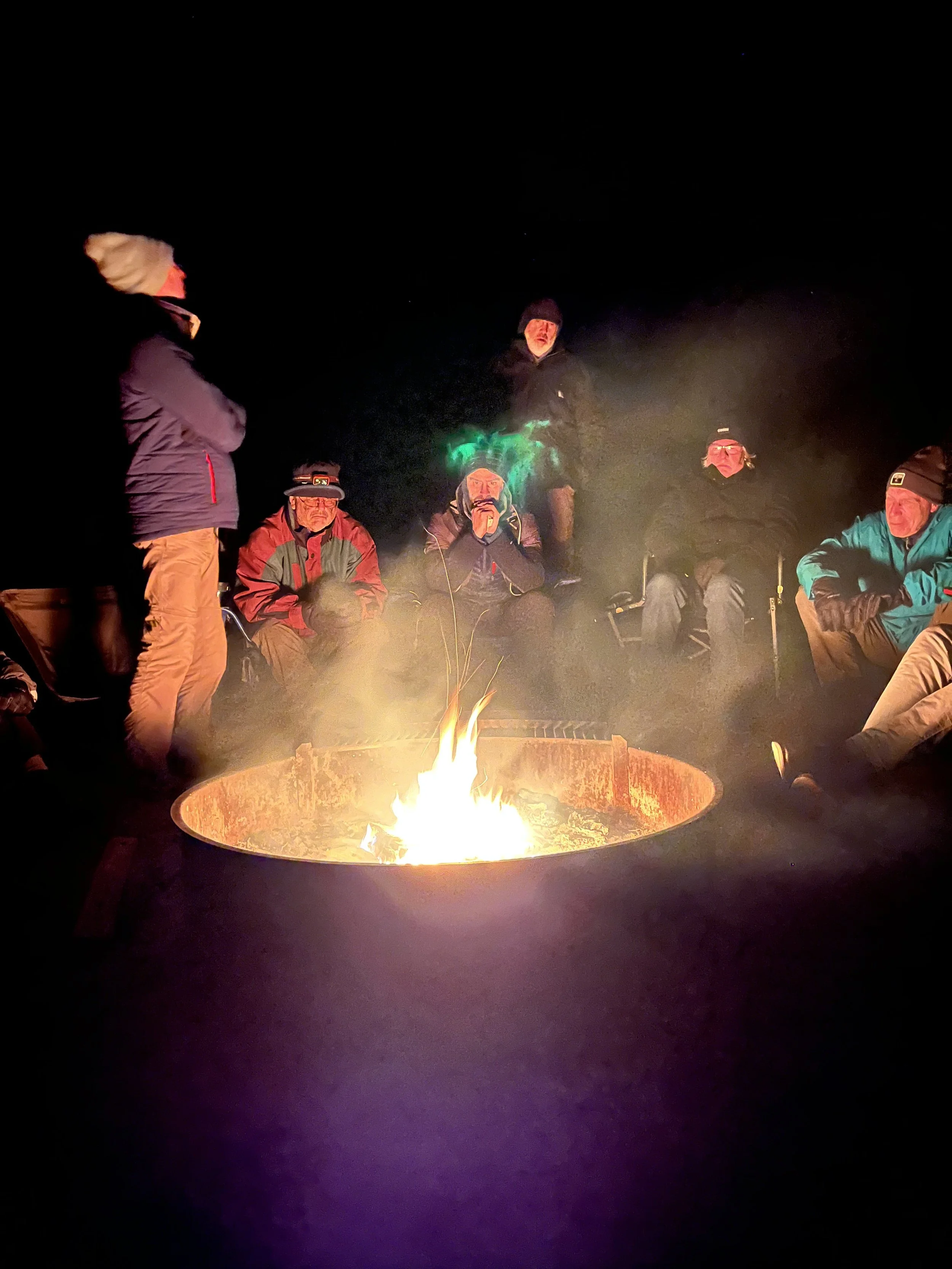 A group of people gathered around a campfire at night, some sitting and some standing, dressed in winter clothing.
