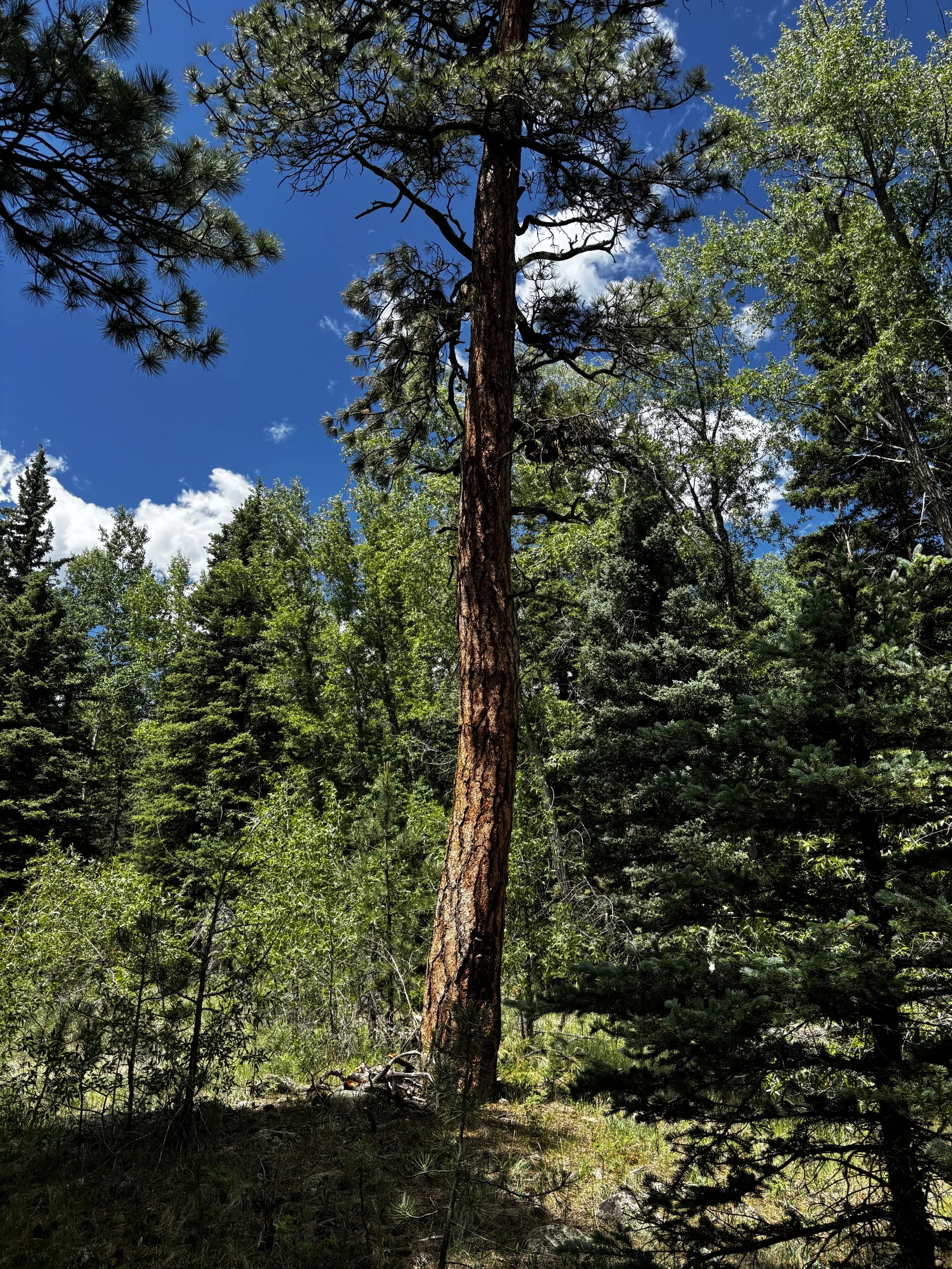 Tall pine tree in a dense forest with a bright blue sky and clouds in the background.