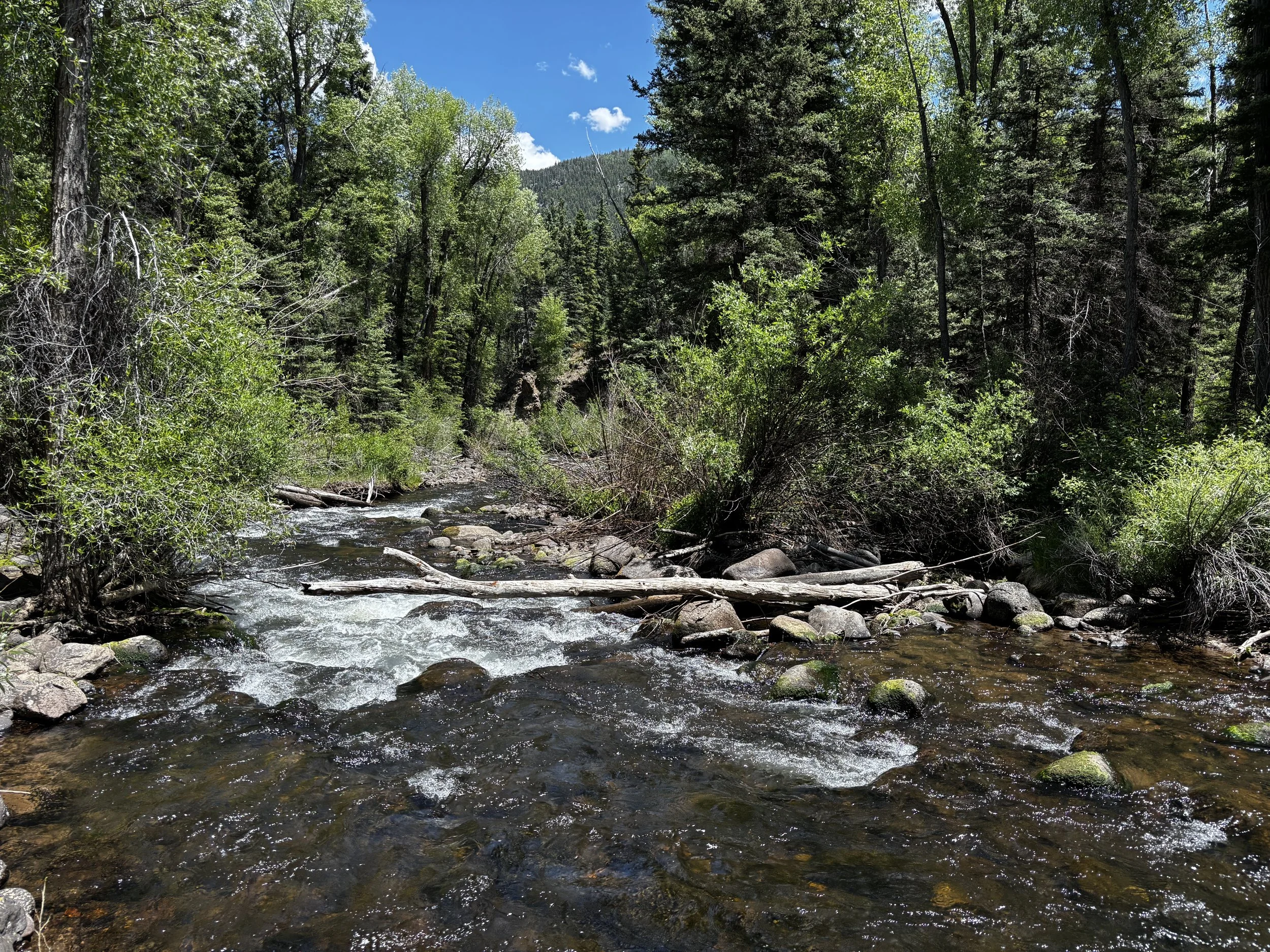 A mountain stream flowing through a forest with lush green trees and rocks under a partly cloudy blue sky.