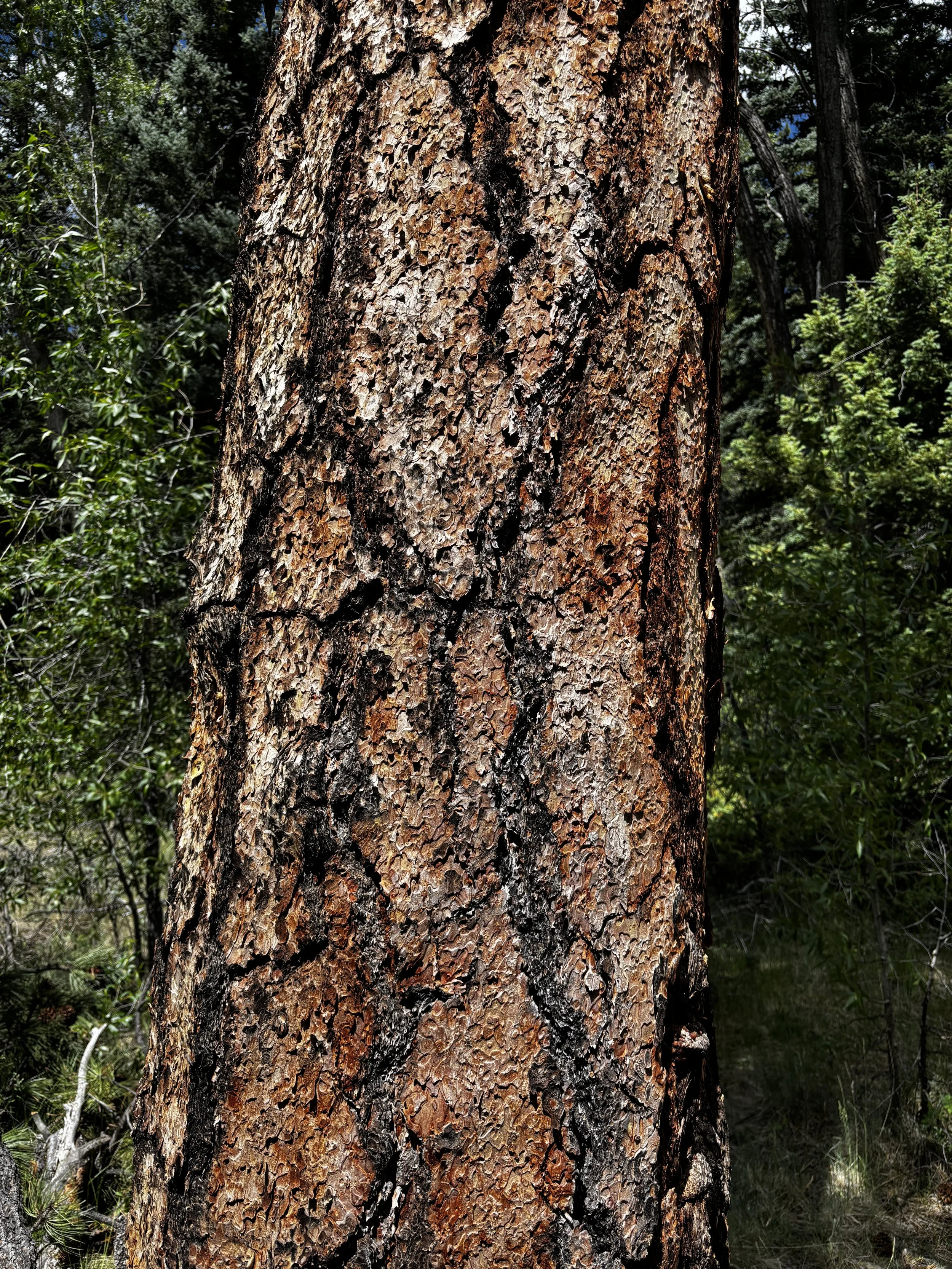Close-up of a tree trunk with rough, textured bark in a forest setting with green foliage in the background.
