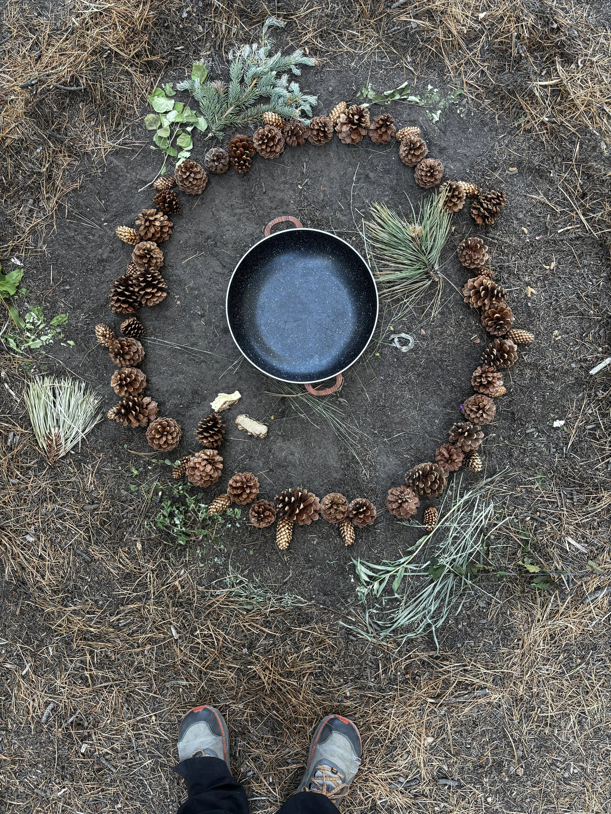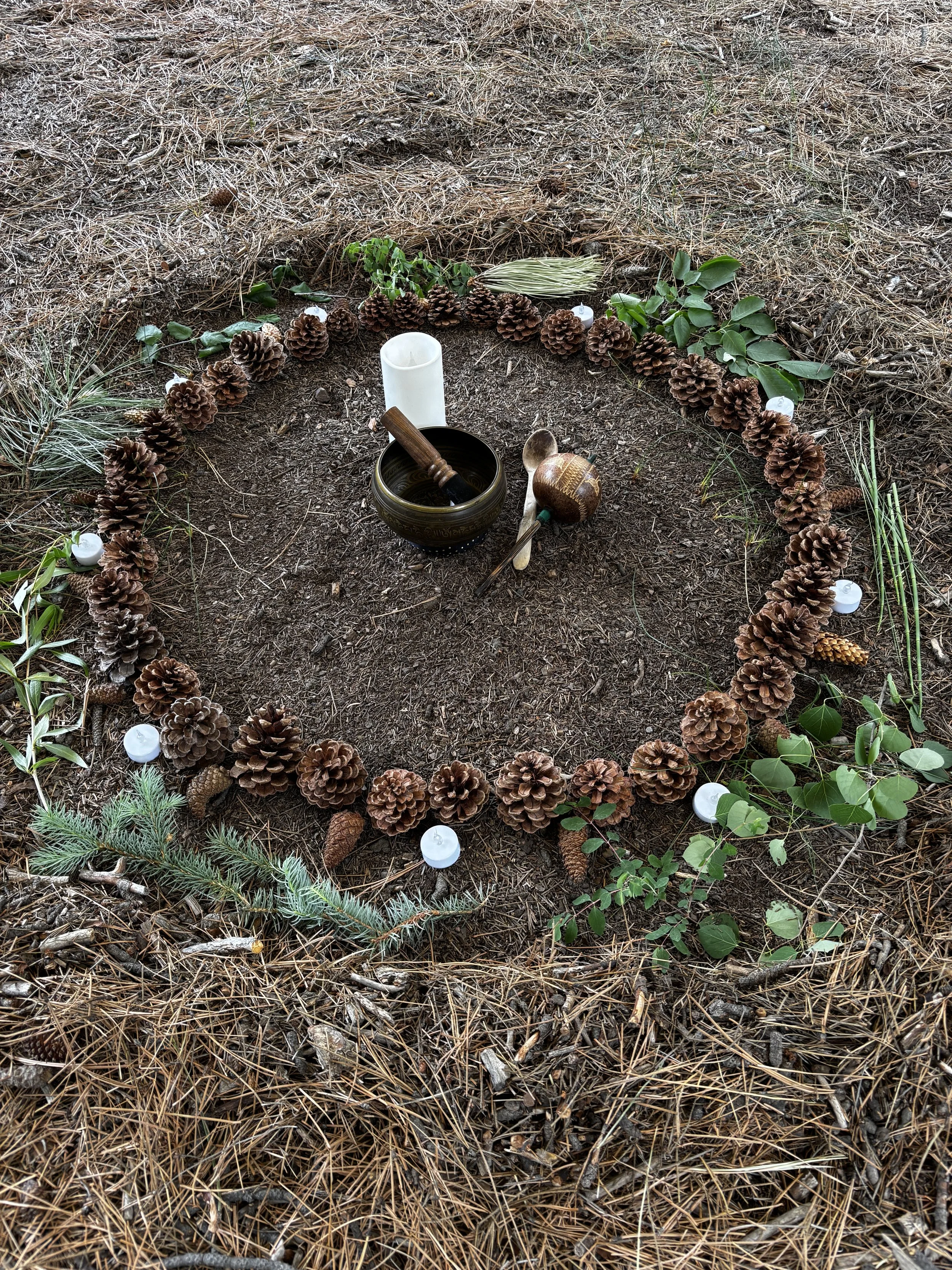 Natural memorial circle on ground with pinecones, candles, and ritual items, surrounded by pine needles and greenery.