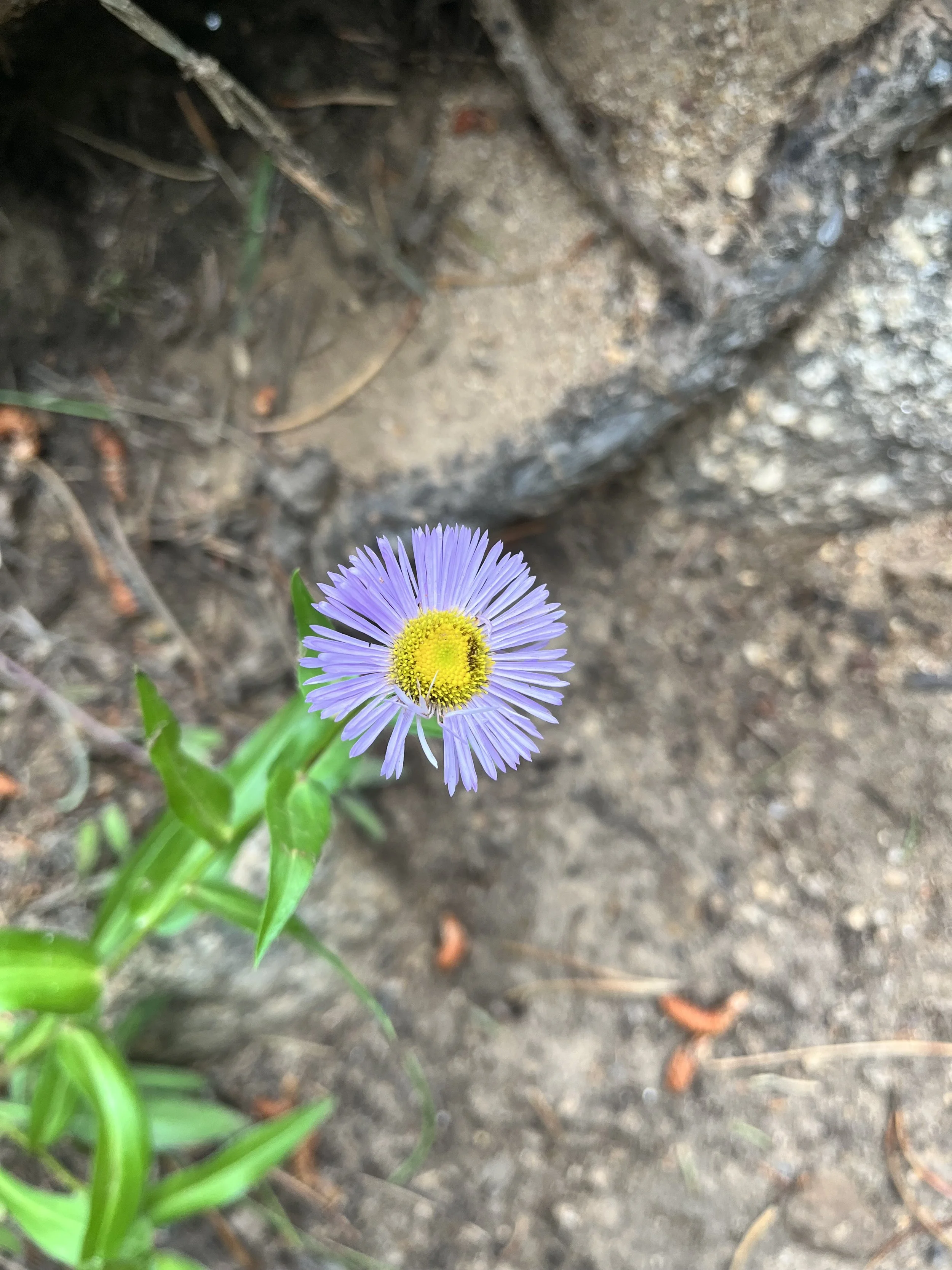 A small purple and yellow wildflower with green leaves growing in dry dirt