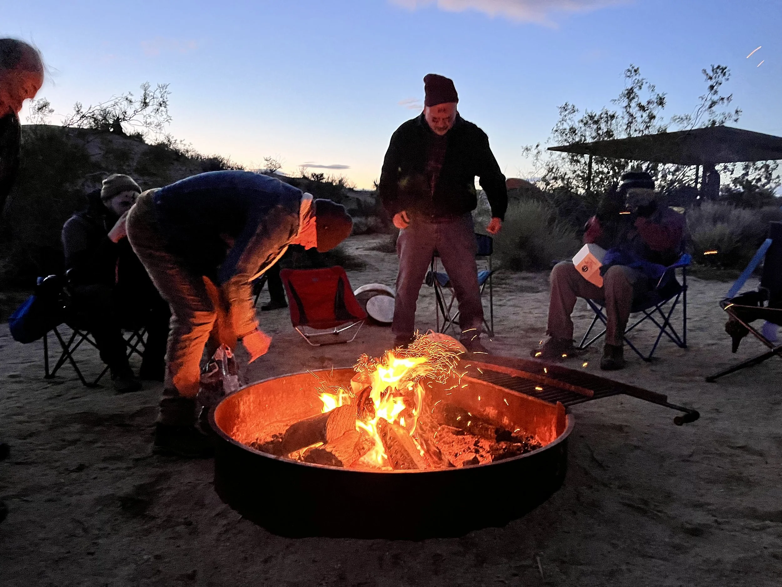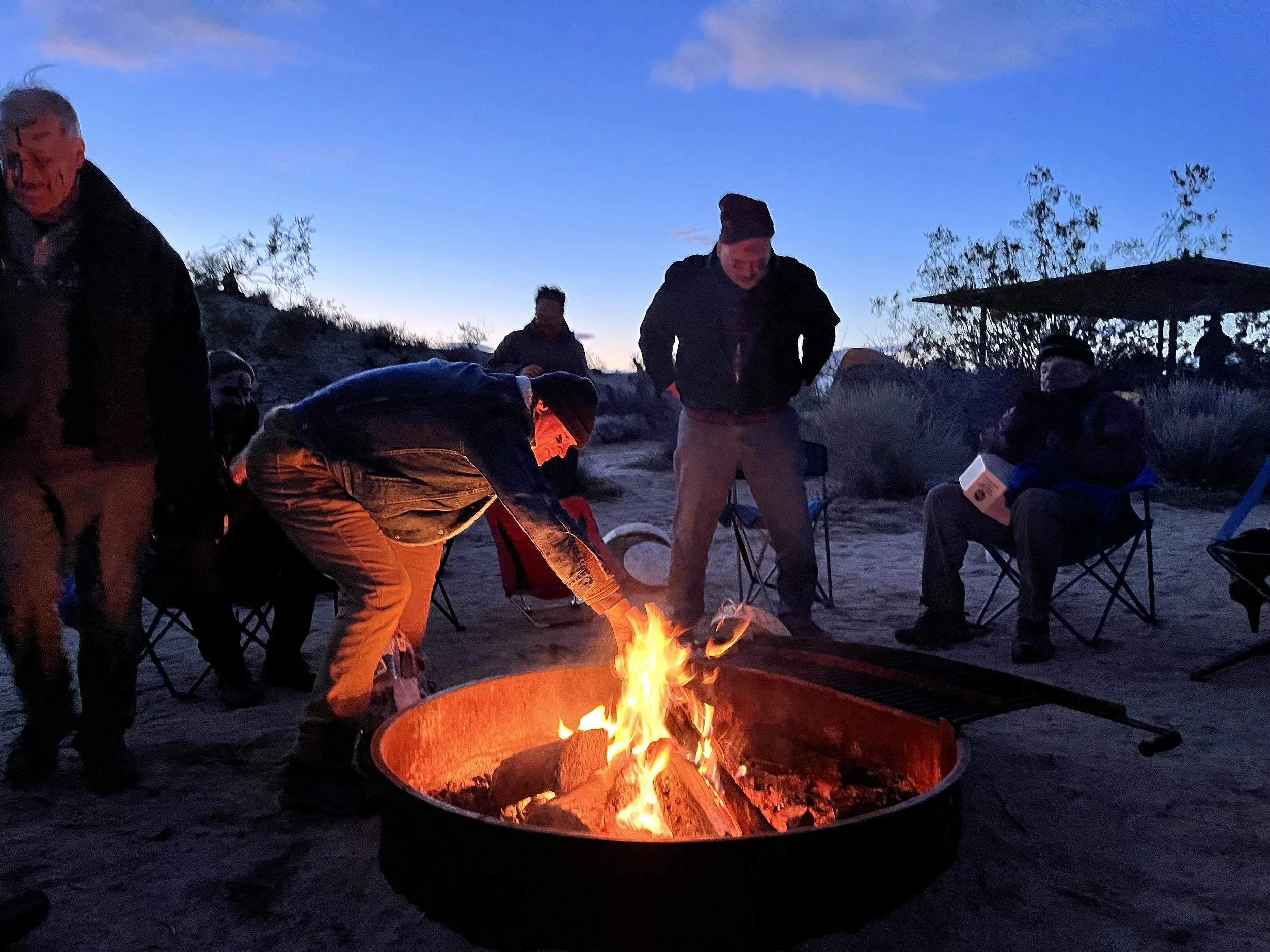 Group of people gathered around a campfire outdoors at dusk, some sitting in chairs and others standing, in a desert landscape with bushes and a covered shelter in the background.