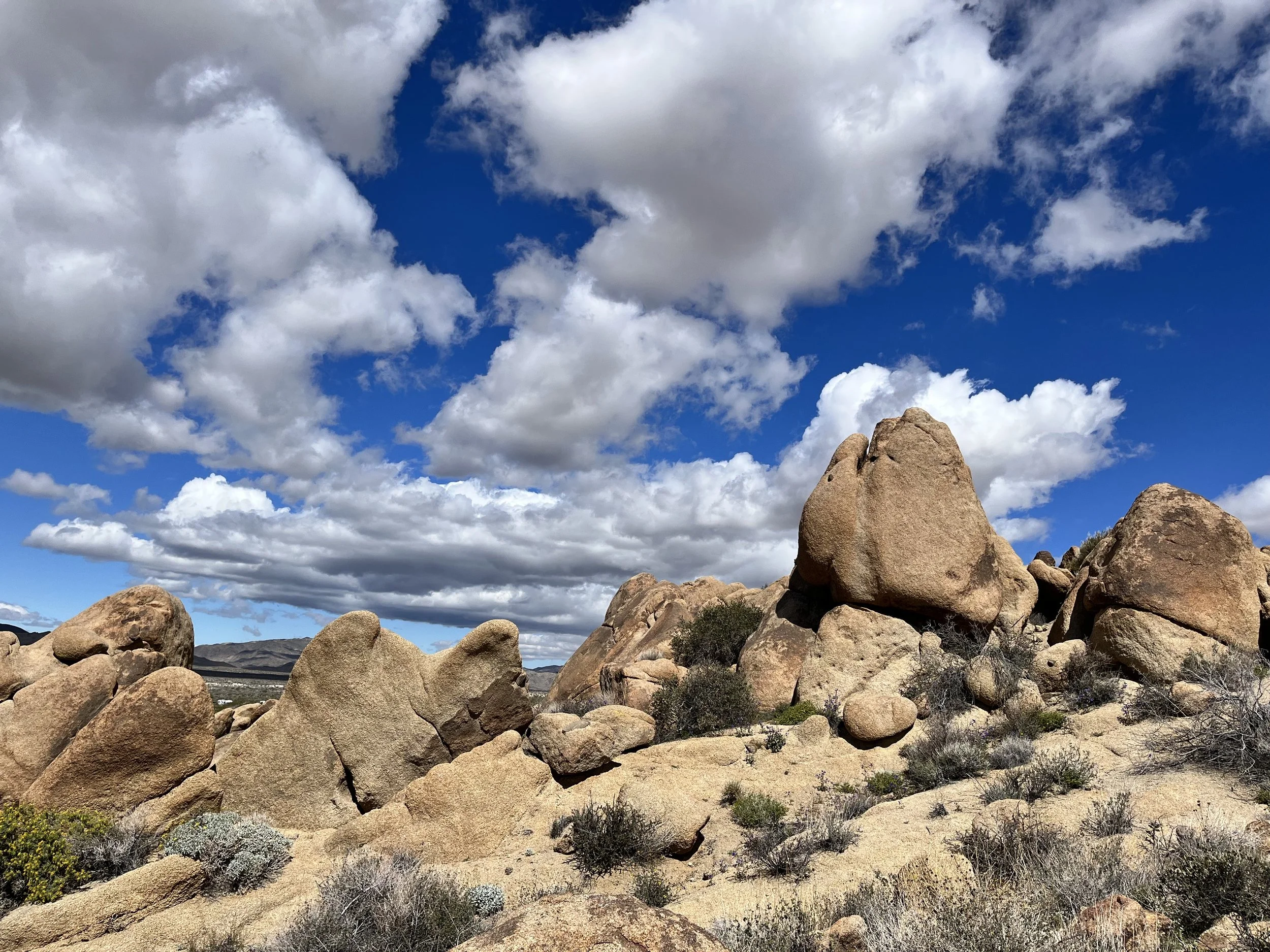 Desert landscape with large boulders and rocks under a partly cloudy blue sky.