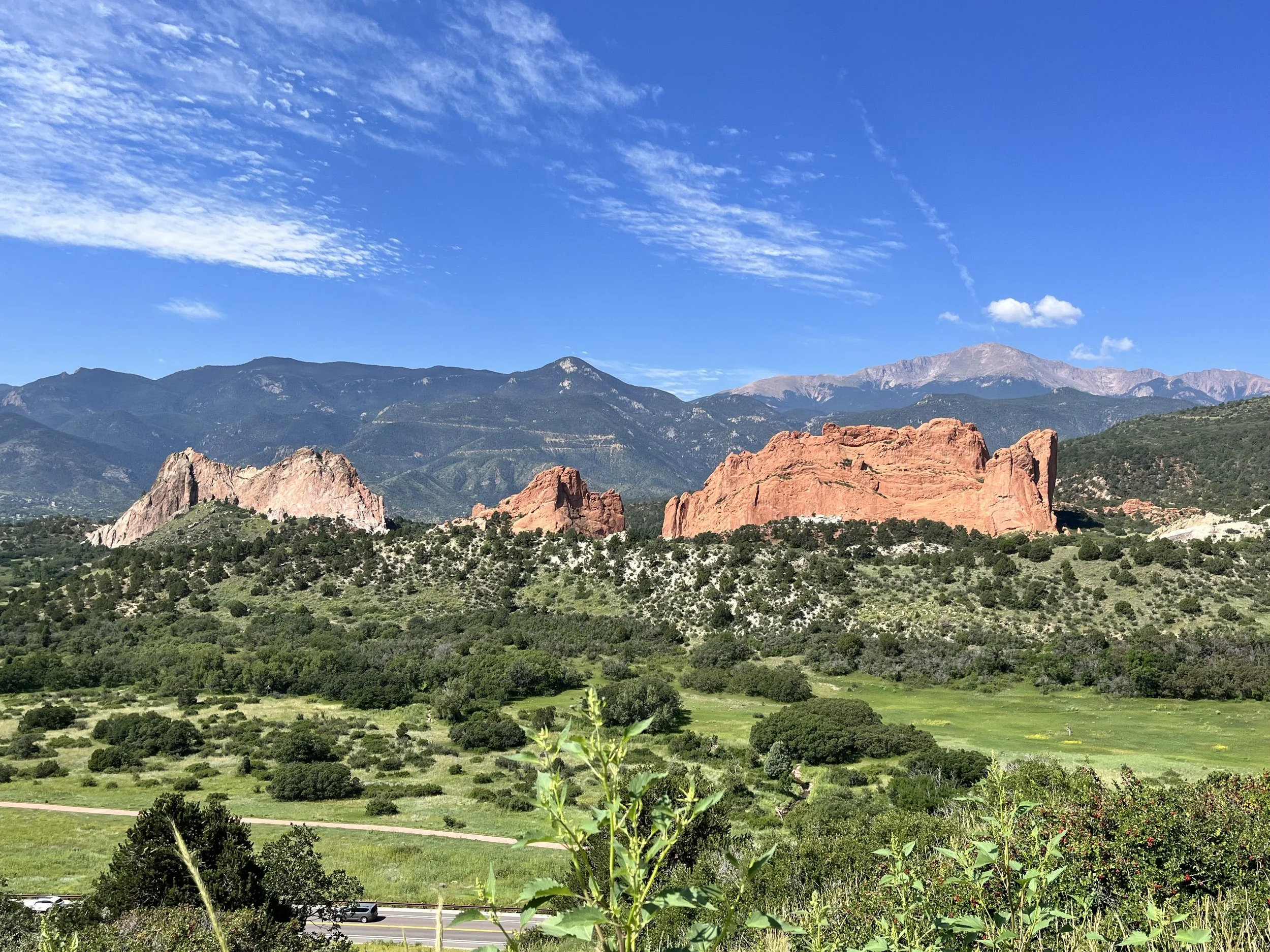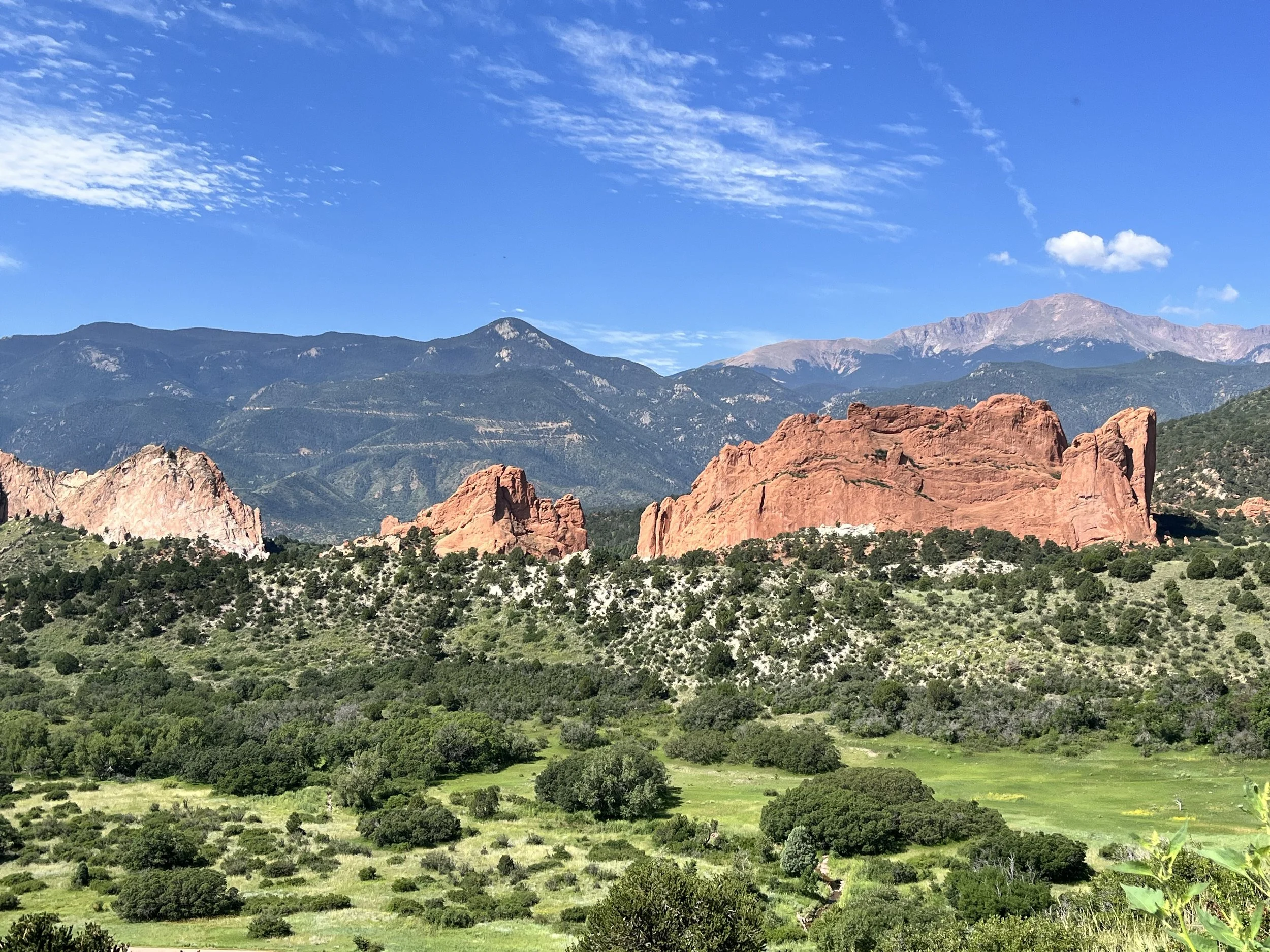 Red rock formations with green trees and grass, mountains in the background, and a blue sky with clouds.