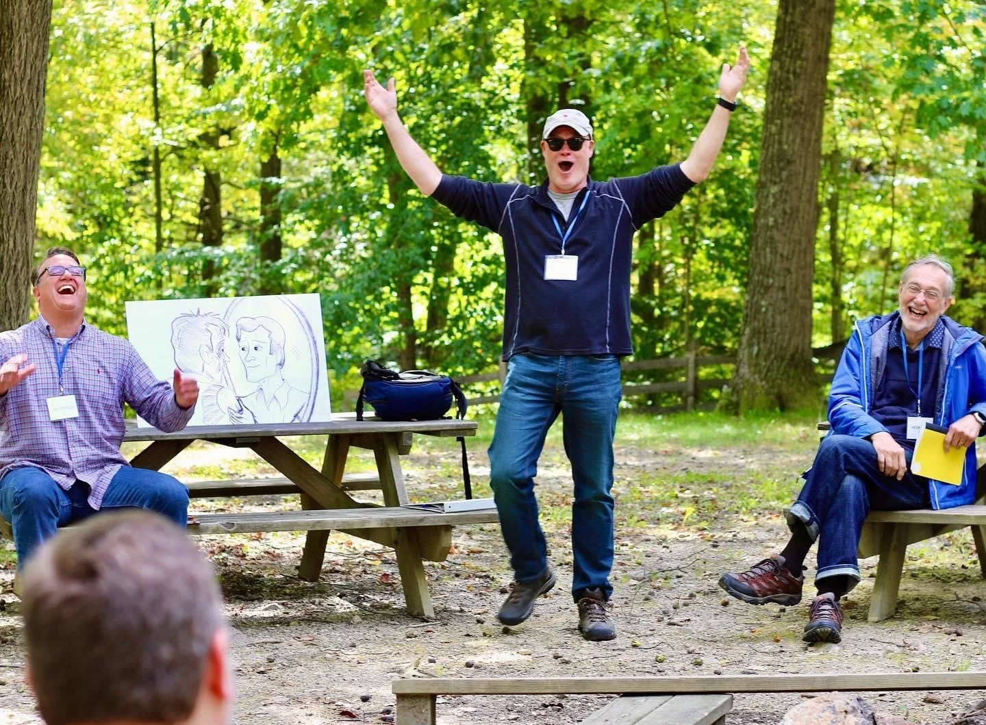 Two adults outdoors in a wooded area, laughing and smiling. One is sitting at a picnic table with a caricature drawing of two faces on a board, and the other is standing with arms raised. Both are wearing sunglasses and name tags, indicating they are
