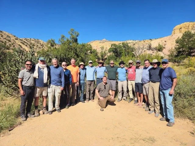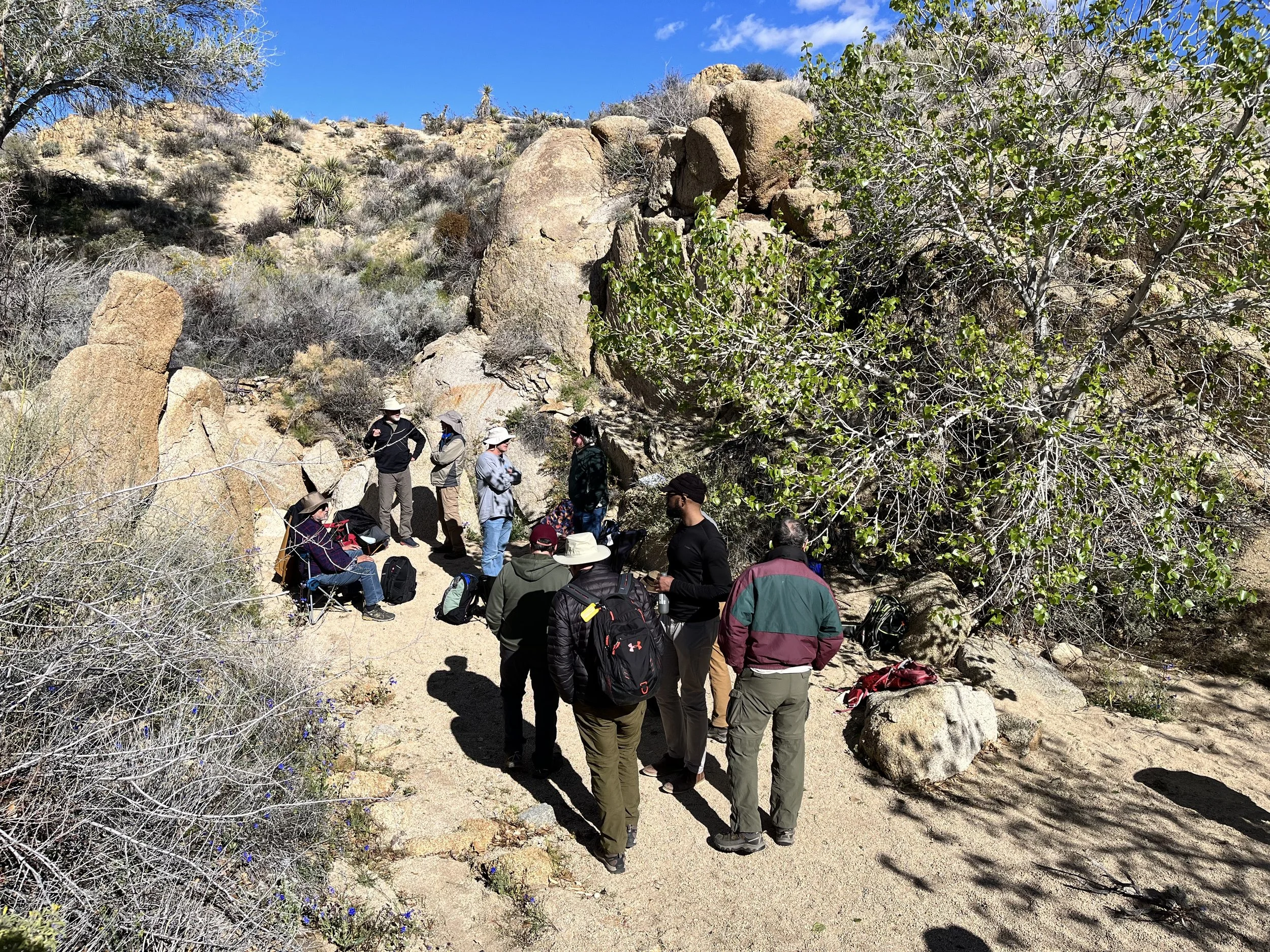 Group of 14 people standing on a dirt trail in a desert landscape with hills, trees, shrubs, and a clear blue sky.