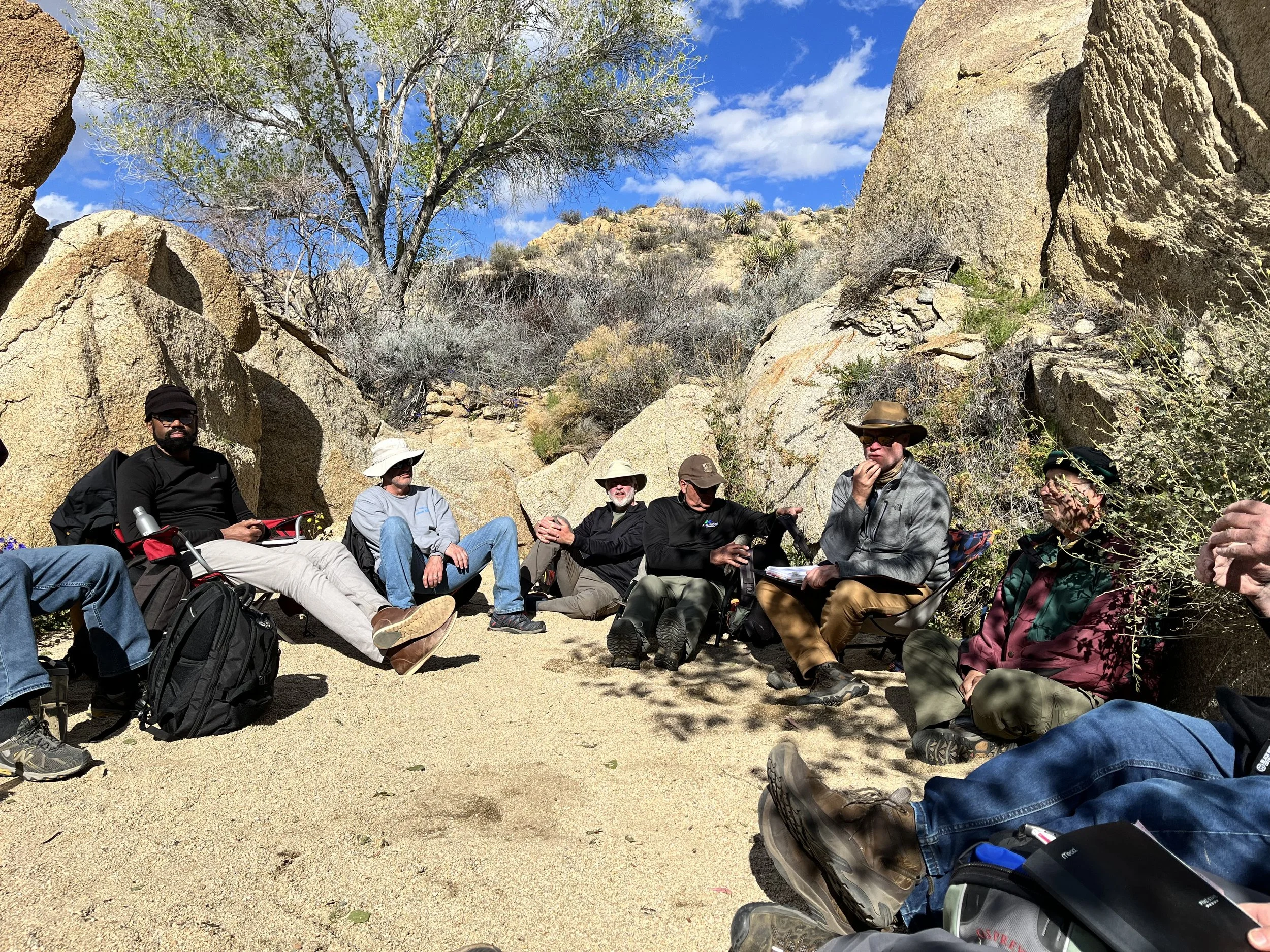 Group of people sitting outdoors on rocky terrain with desert landscape and clear blue sky, engaged in conversation.