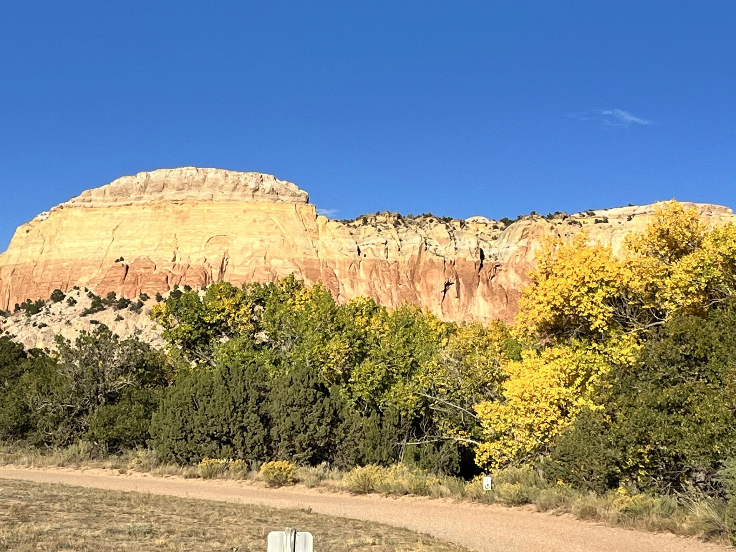 A colorful landscape featuring a large, multi-colored rock formation with layers of yellow, pink, and cream, set against a clear blue sky, with trees and bushes in fall colors in the foreground.