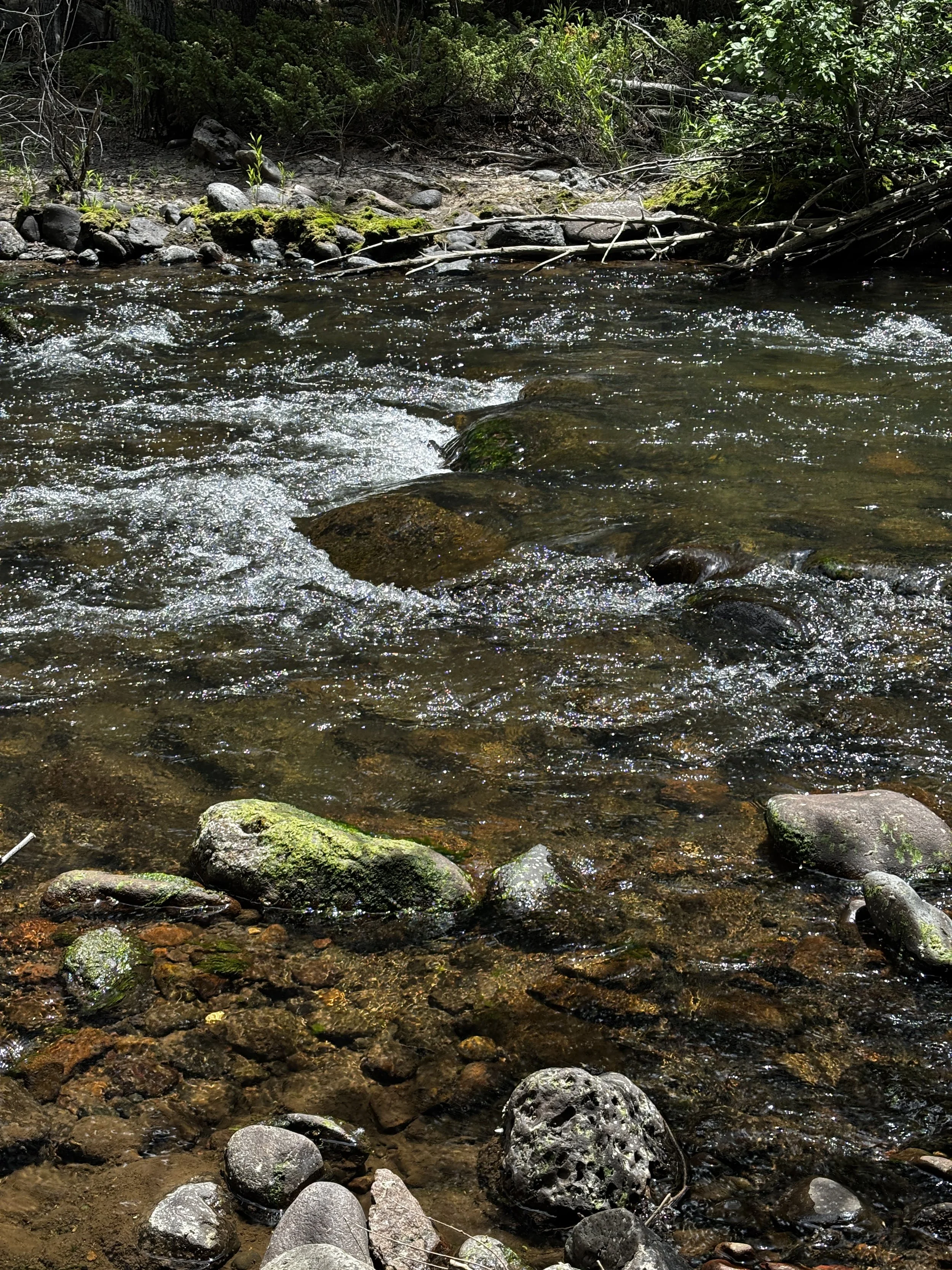 A shallow river with rocks and pebbles on the bottom and moss-covered rocks on the banks, surrounded by green bushes and trees.