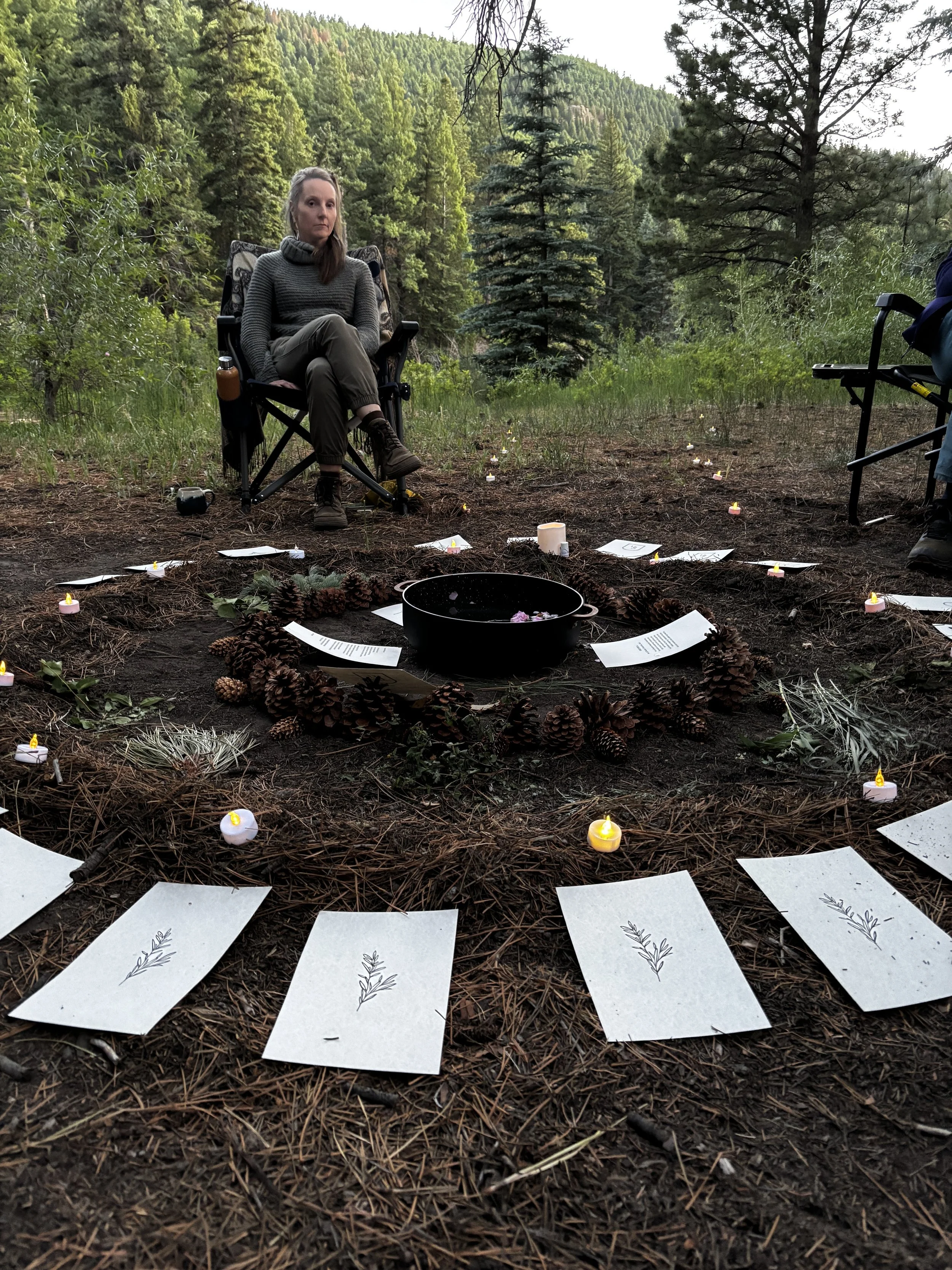 A woman sitting on a camping chair in a forested area, surrounded by candles, pine cones, and paper with botanical illustrations, during dusk or early evening.