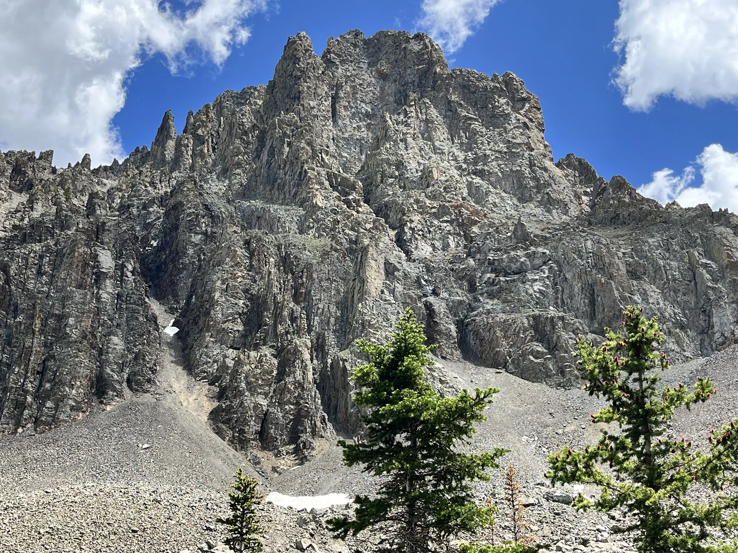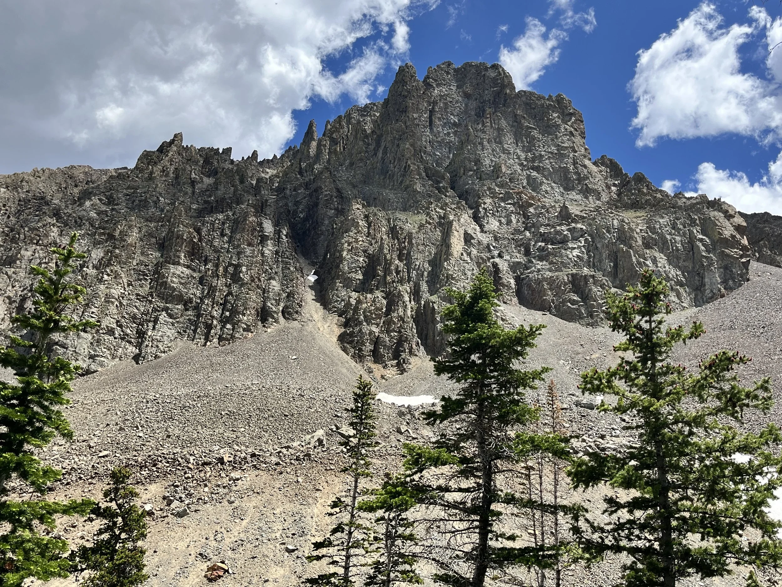 A rugged mountain with steep rocky cliffs rises above a slope covered with rocks and dirt, with some small green pine trees at the bottom, under a partly cloudy blue sky.