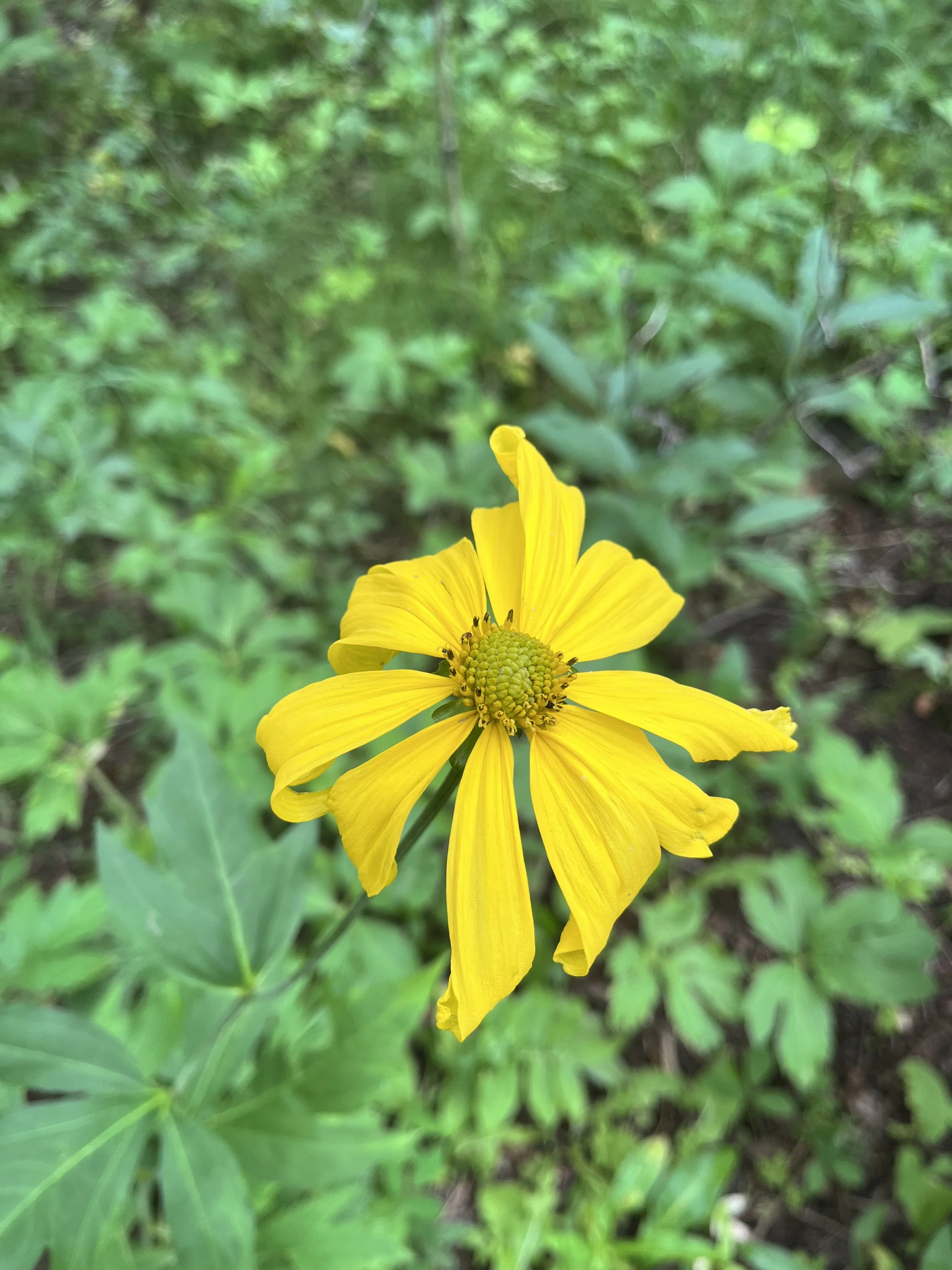 A yellow flower with long, curled petals and a green center, surrounded by green leaves and foliage.