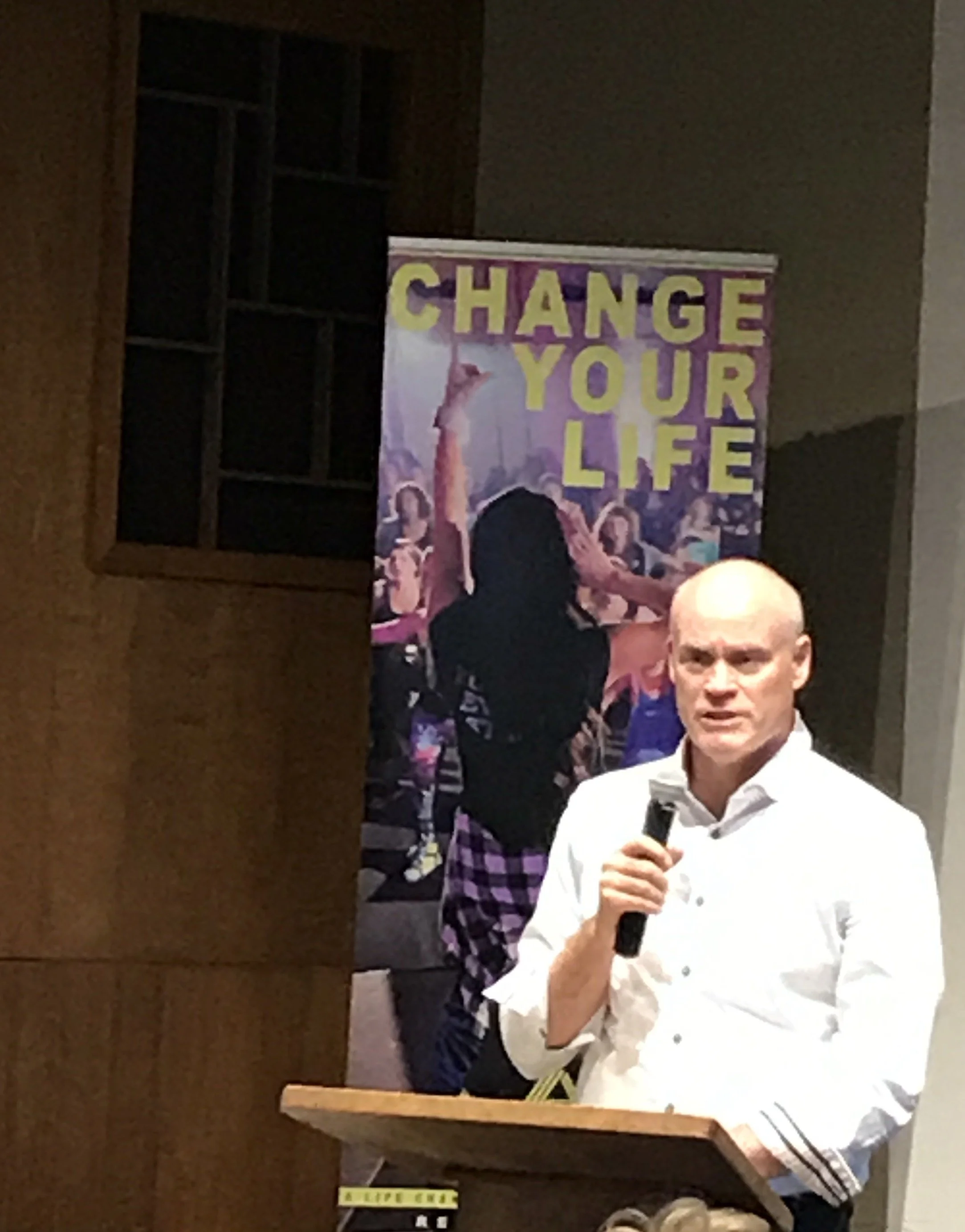 A man in a white shirt holding a microphone standing behind a podium with a banner behind him reading 'CHANGE YOUR LIFE' and showing people dancing.
