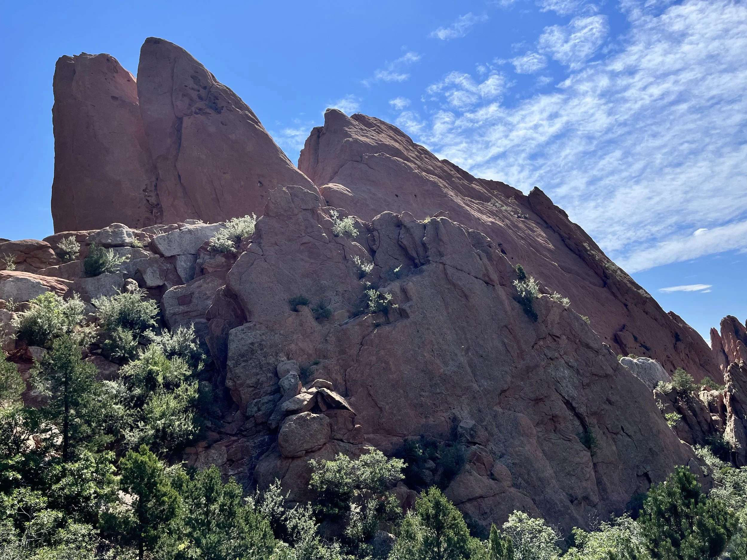 Large red rock formations in a desert landscape with green bushes and trees at the base, under a bright blue sky with scattered clouds.