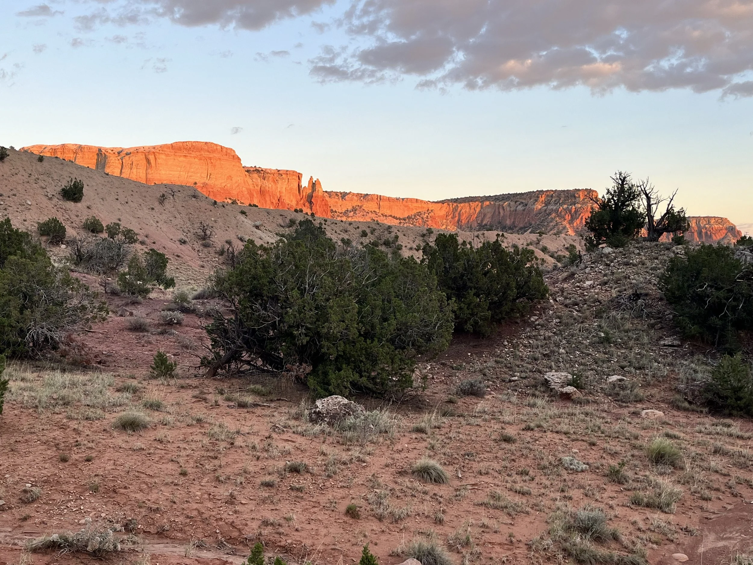Sunset over a desert landscape with red rock formations, sparse vegetation, small bushes, and a few trees.