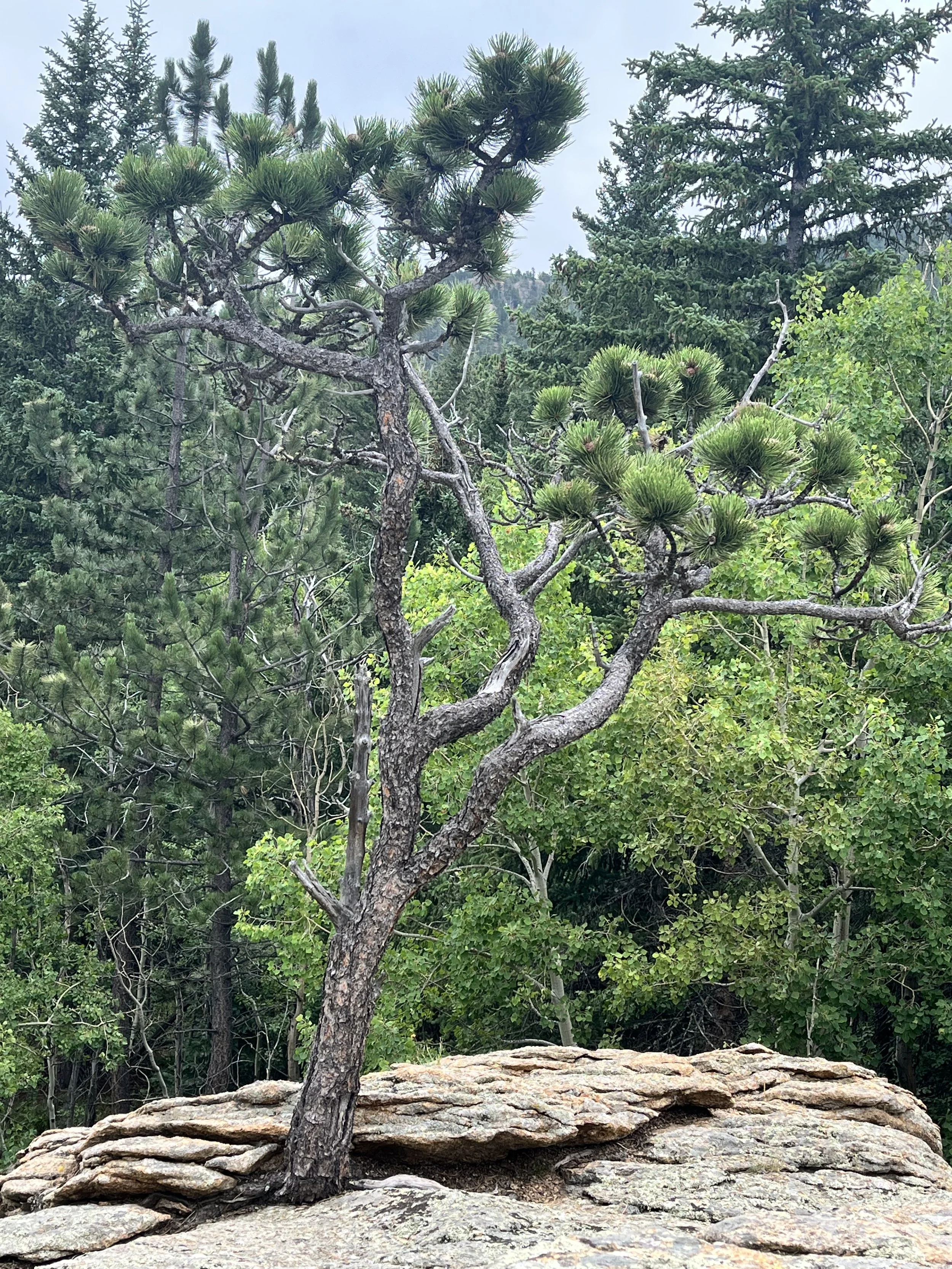 A gnarled pine tree growing on a rocky surface with lush green trees and dense forest in the background.