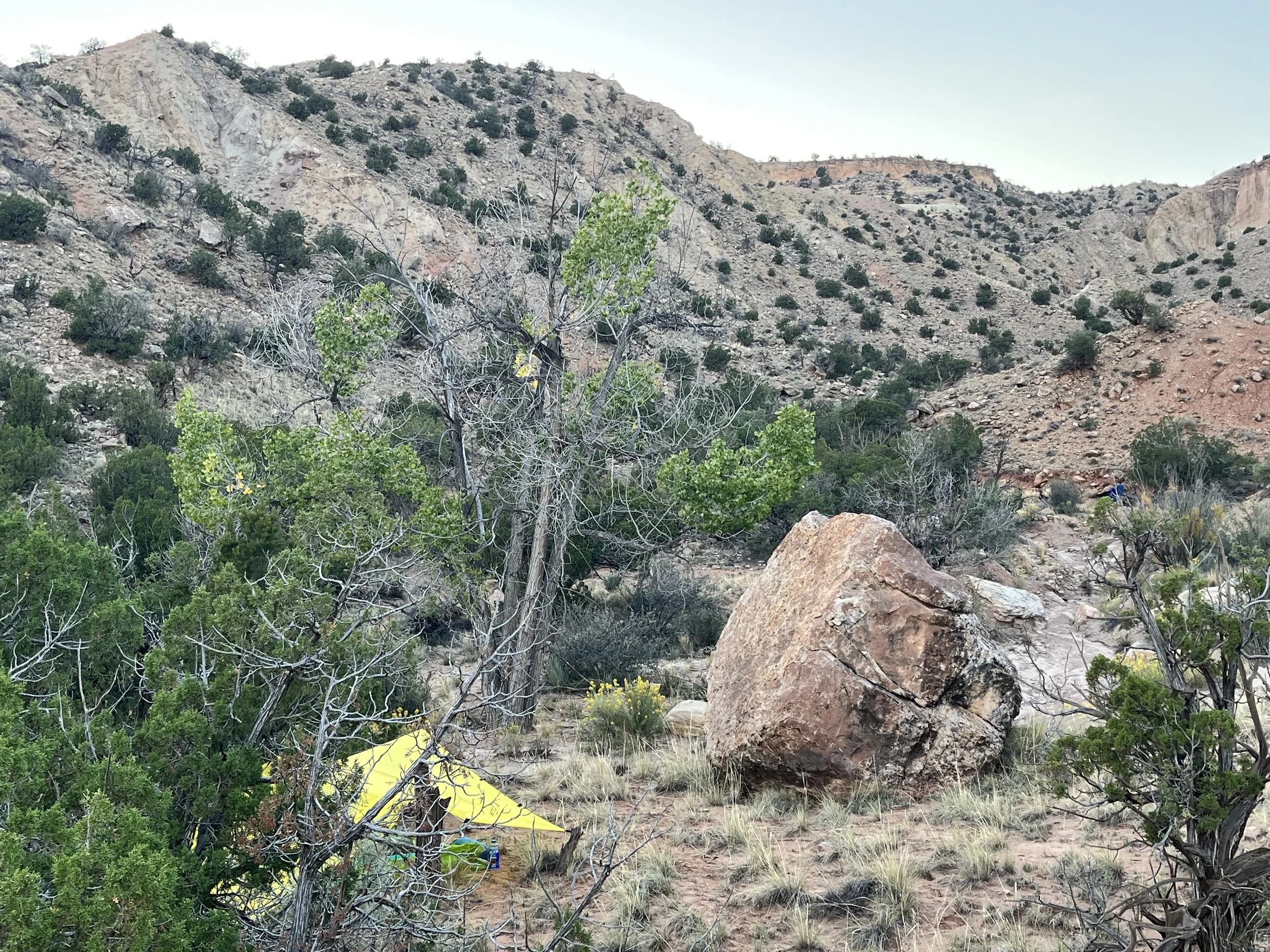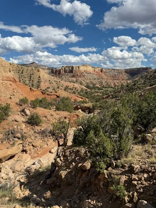 Desert canyon landscape with rocky terrain, sparse bushes, and a blue sky with scattered clouds.