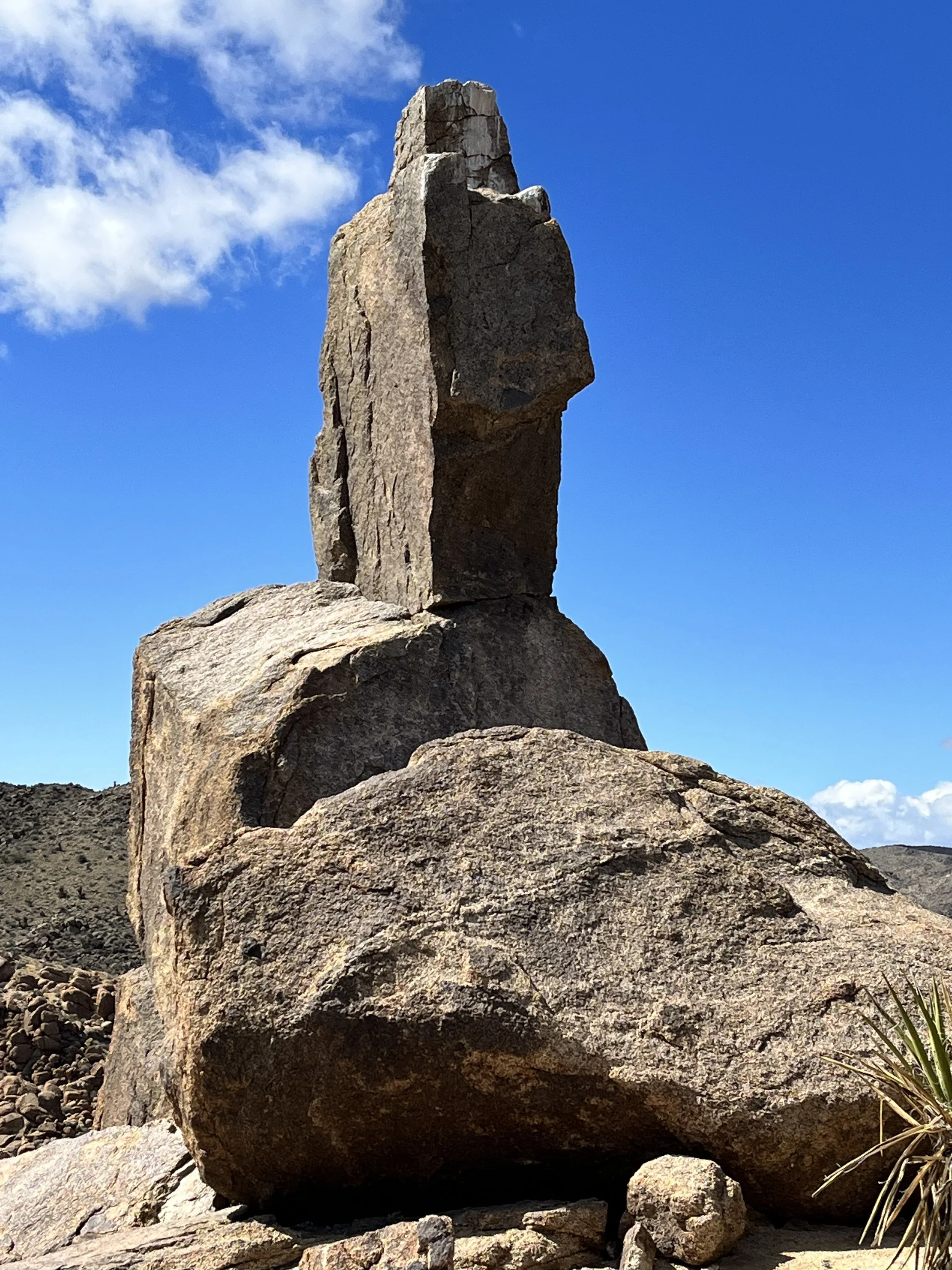 Large rock formation with a tall, narrow vertical rock balanced on a broad rock in a desert landscape with blue sky and some clouds.