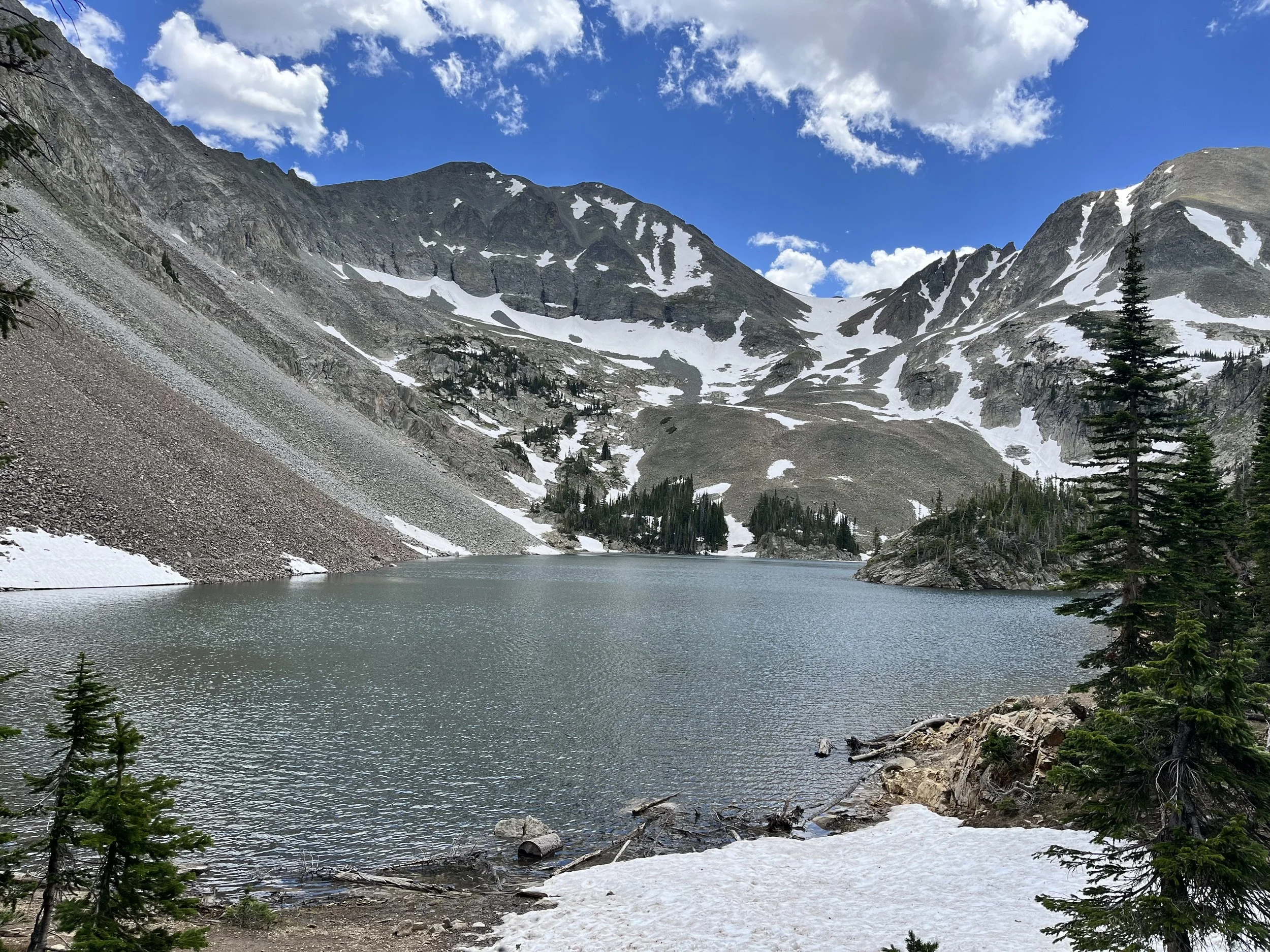 Scenic mountain lake with snow patches, evergreen trees, rocky shores, and towering snow-capped mountains under a partly cloudy blue sky.