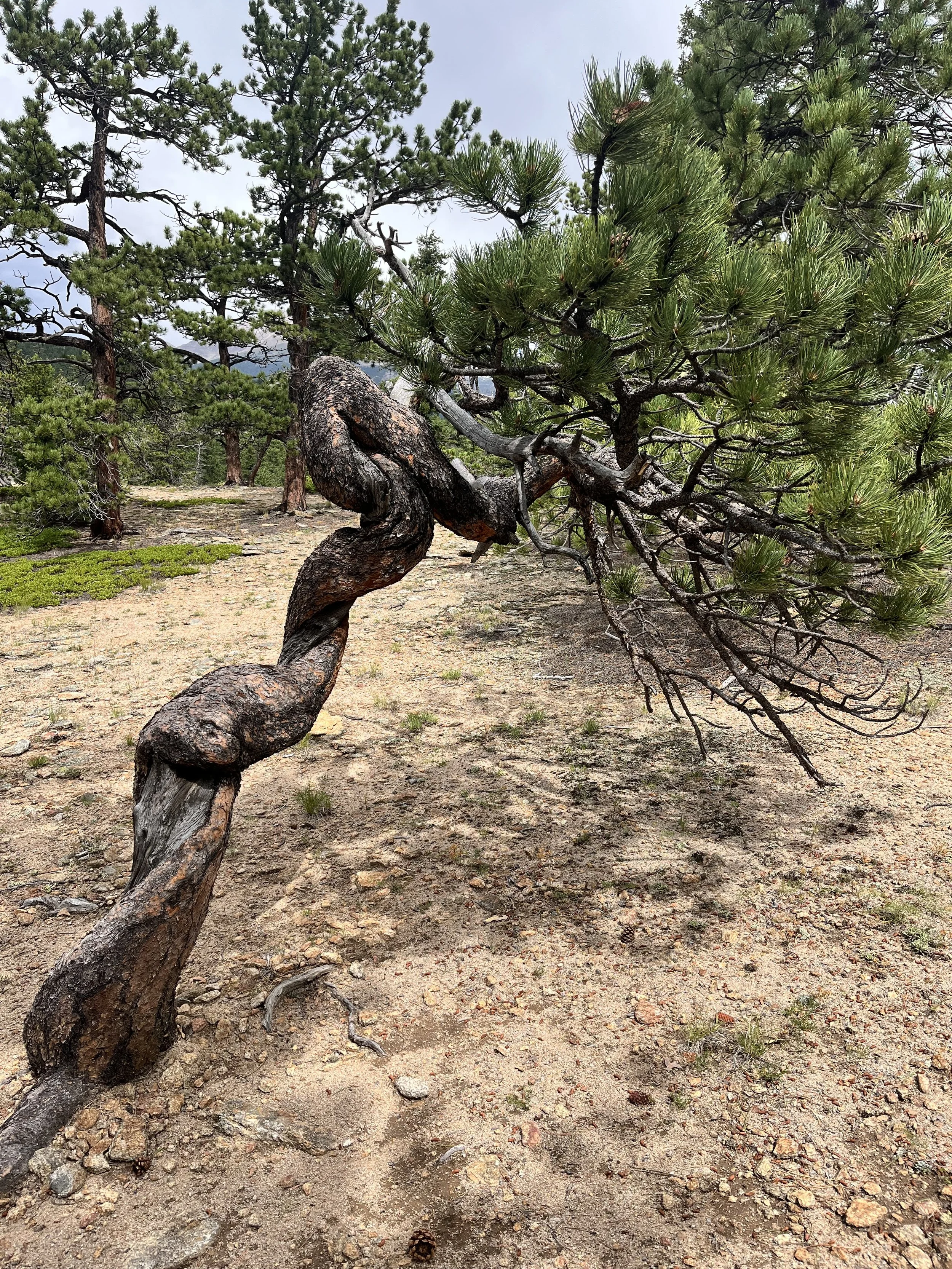 A twisted pine tree with a curved trunk and green needles in a natural landscape.