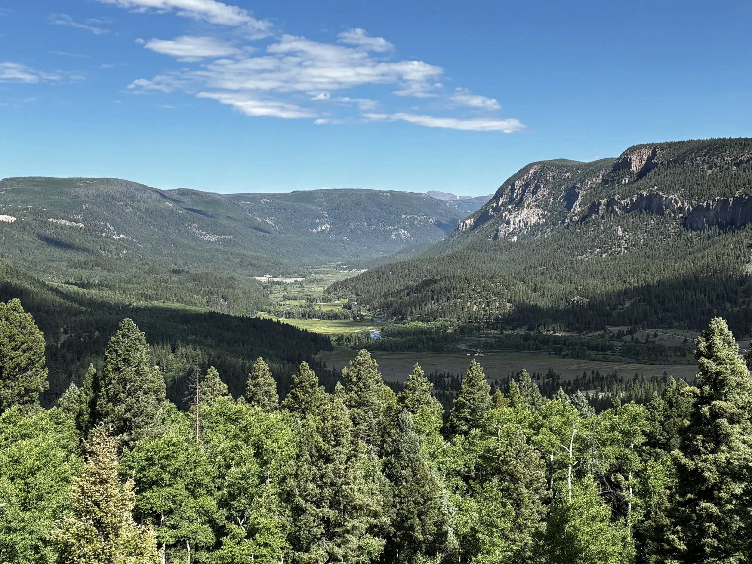 A lush green valley surrounded by mountains with a clear blue sky overhead.