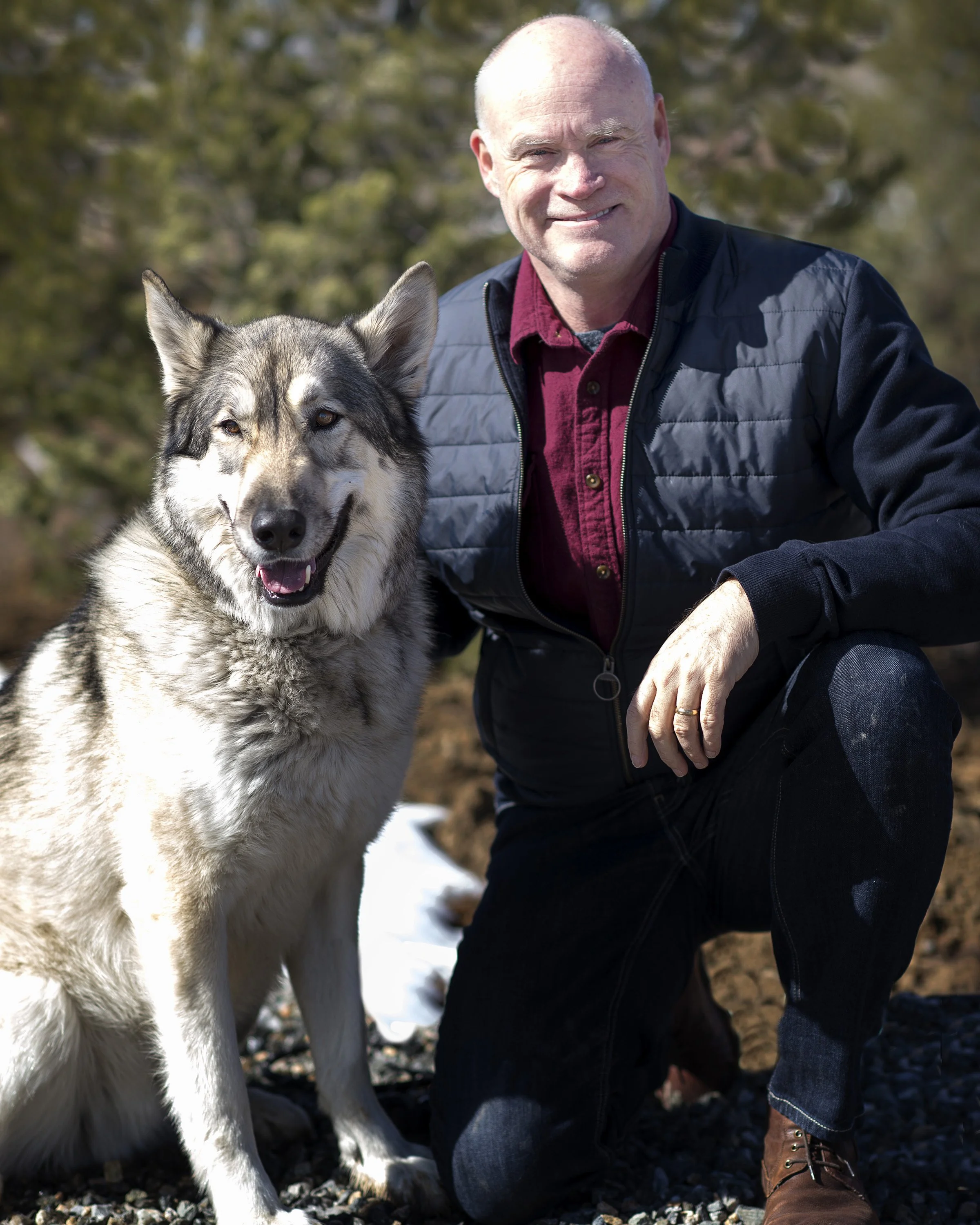 A man with a bald head and a smiling face kneels next to a large, fluffy Siberian Husky dog outdoors with a background of trees.