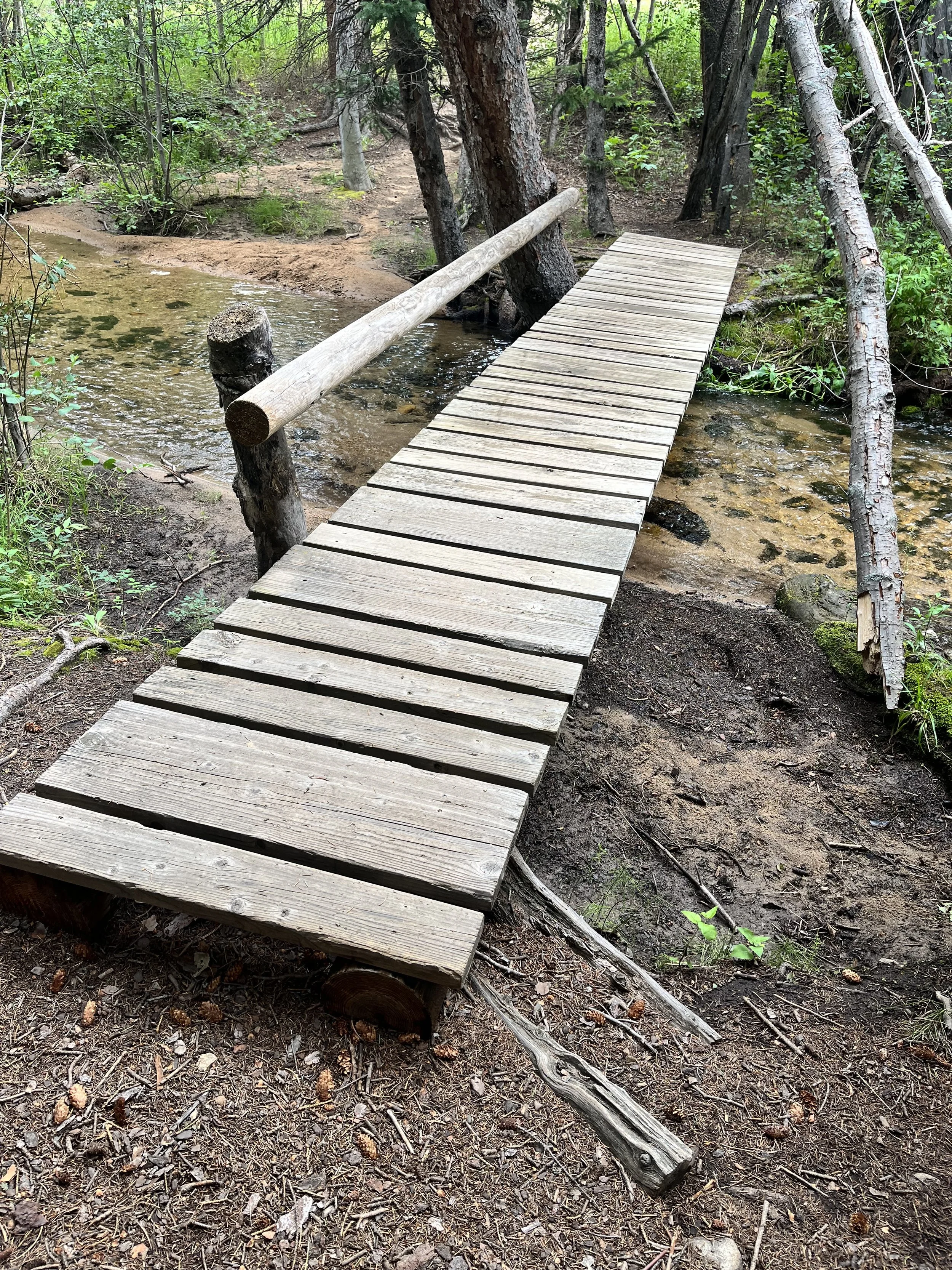 A small wooden footbridge with a handrail crosses a shallow stream in a forested area. Green trees and plants surround the scene.