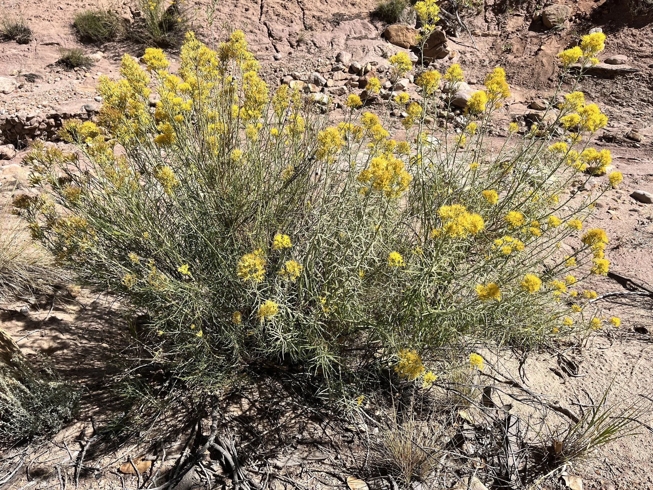 Yellow flowering desert plant growing in sandy soil with rocks and dry terrain.